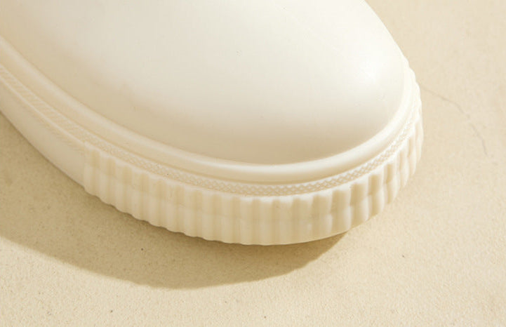 These boots feature an ankle-height shaft with a closed rounded toe front. Elastic side panels are positioned on both sides of the upper to allow pull-on entry without fastenings. A thick platform-style sole is attached beneath the boot with a raised profile and visible tread lines.