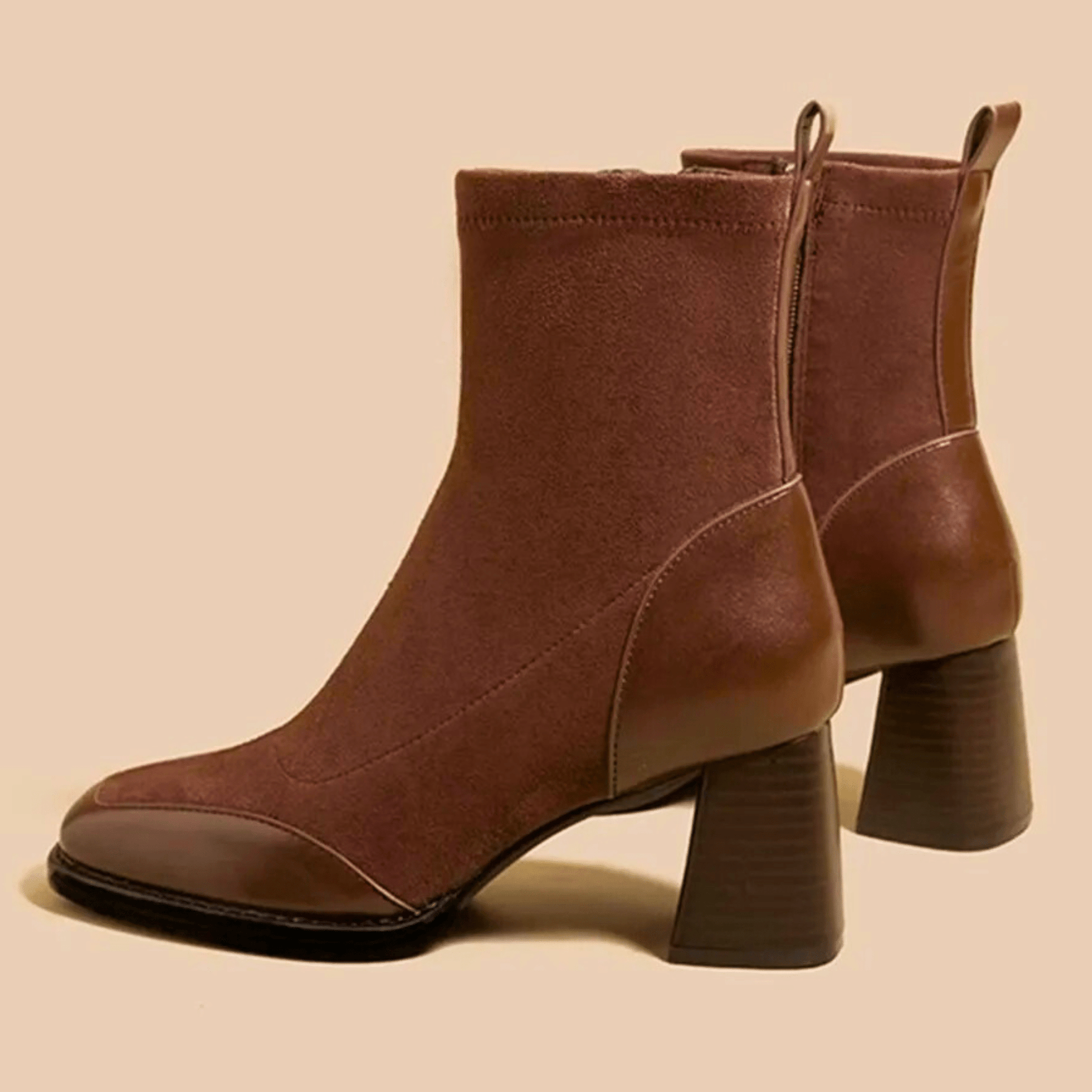 These boots feature an ankle-height shaft with a closed rounded toe front. A block heel is positioned beneath the rear of the sole with a straight vertical structure. The upper includes a side zipper and contrasting panel sections around the toe and heel areas.