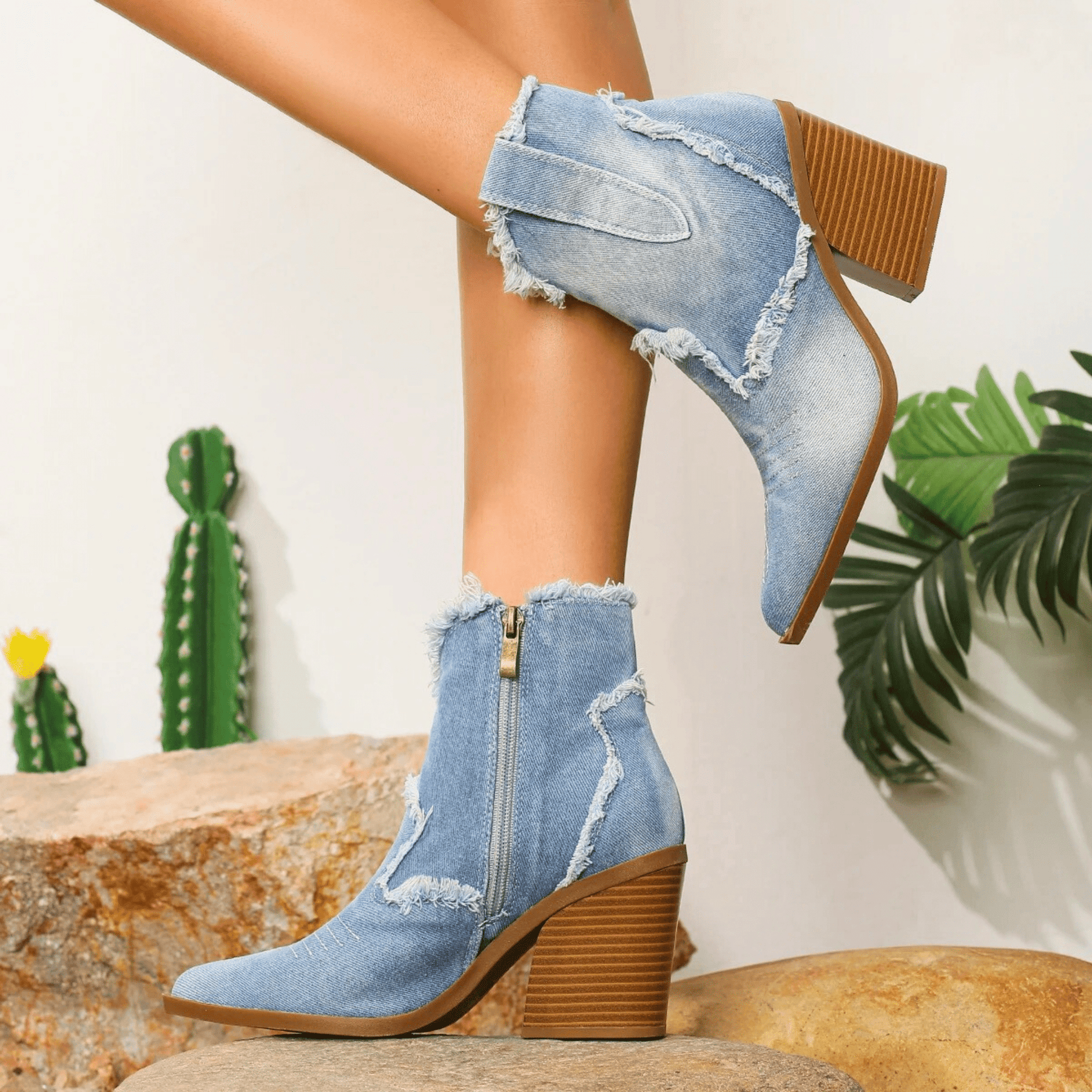 These boots are designed with an ankle-height shaft, a closed toe front, and a raised block heel. The upper features stitched panel sections with exposed edge detailing and a side zipper opening. A defined sole outline and vertically aligned heel complete the overall shape.